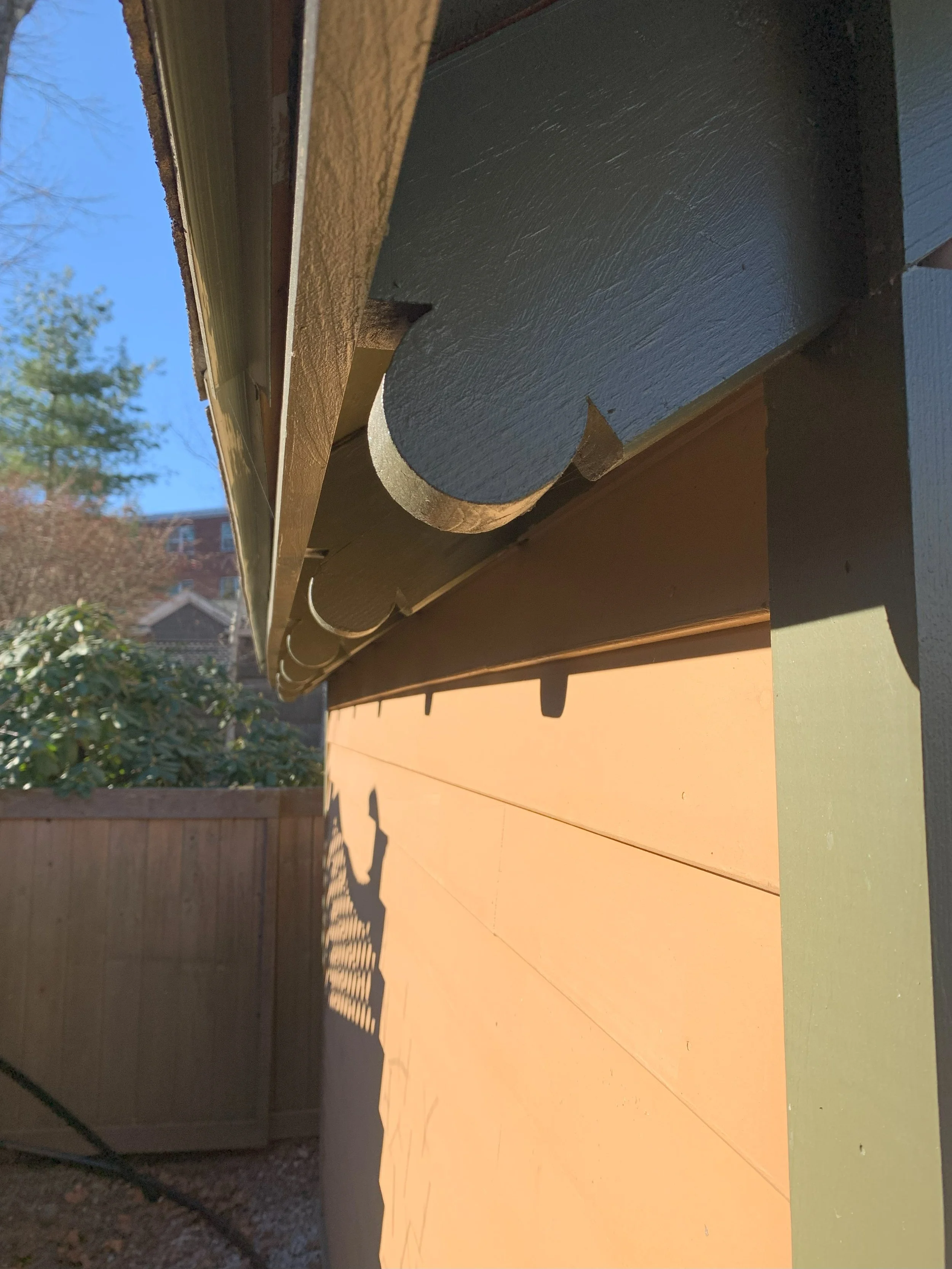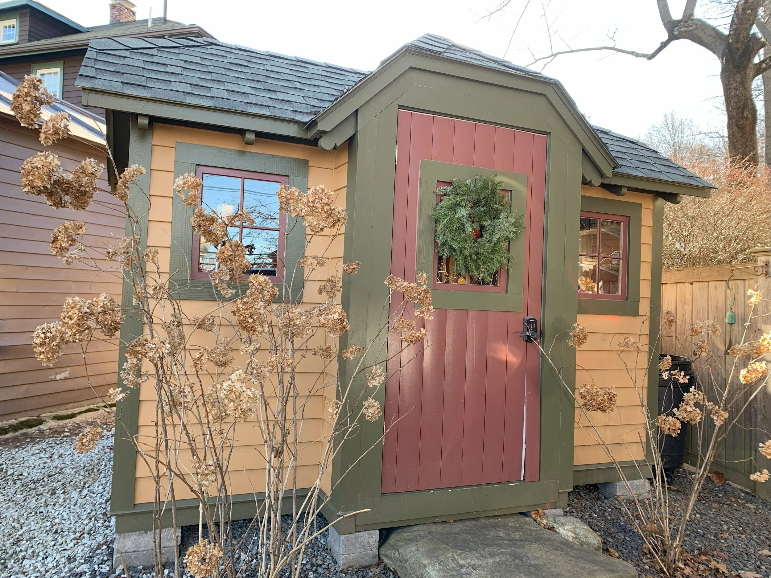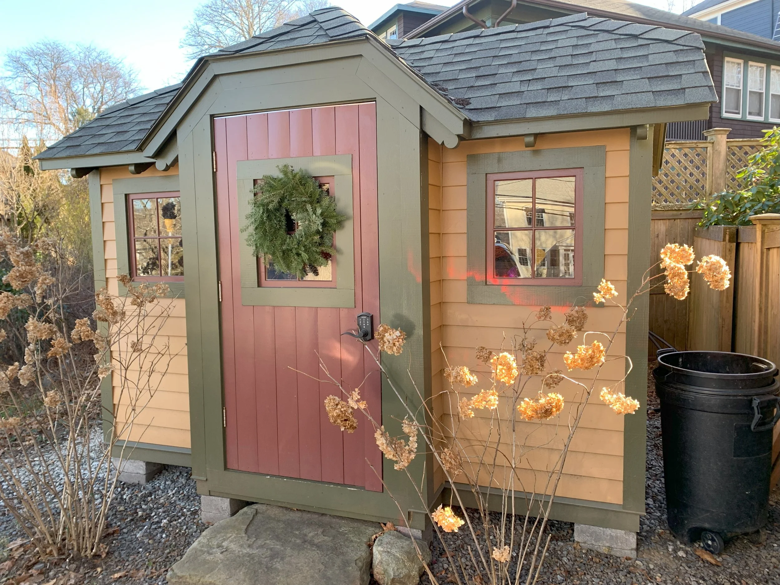 This shed was custom built to complement the look of the home. It features clapboard siding, custom windows, and detailed rafter tails that add character and charm.